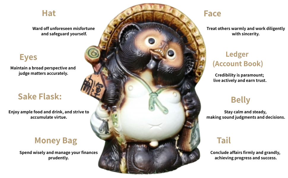 • Origins: Late Edo period potters began crafting sake-flask-holding tanuki figures as good-luck charms.